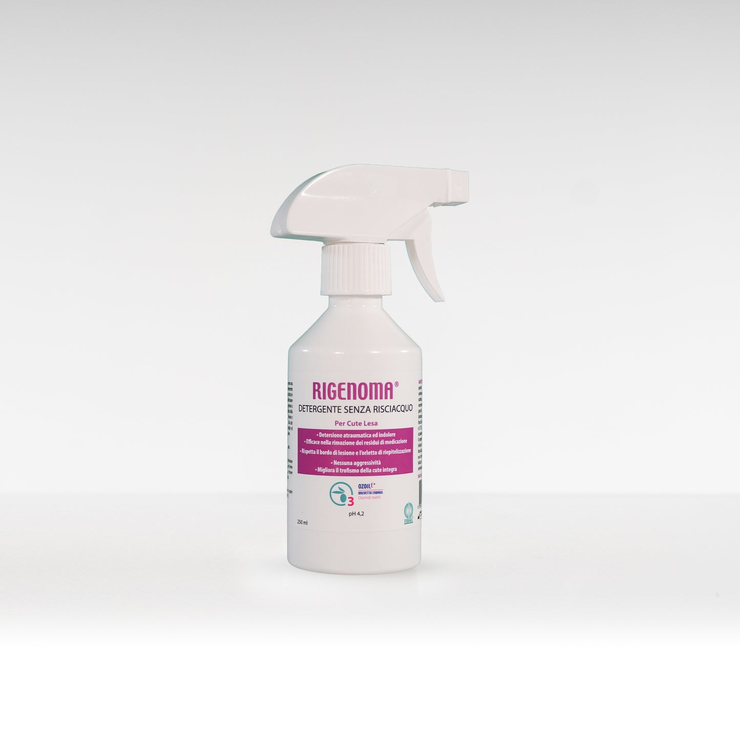 Rigenoma® Leave-In Cleanser with Ozoile® acts on cellular redox balance, triggering a cascade of antimicrobial, anti-inflammatory, antipruritic, and tissue-regenerating effects. The synergy between Ozoile® and Lactic Acid at pH 4.2 helps maintain a skin microenvironment unfavorable to microbial proliferation, promoting tissue regeneration and restoring the skin barrier. Its non-occlusive formula gently cleanses without altering the integrity of damaged skin, respecting the re-epithelialization process and reducing the risk of irritation and maceration.